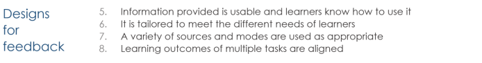 Consequently, we propose that the success of assessment feedback may be facilitated by considering the following twelve conditions. For more information, including some suggested strategies to enact each condition, please visit our pages on capacity, designs, or culture. You can also click on the relevant section in the large text below.
